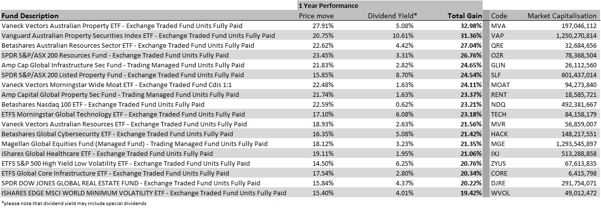 We can see above that many ETFs have achieved significant returns over the past 12-months. Usually some of the biggest returns can be seen in smaller funds, or funds with low market capitalisation. However, over the past 12-months, many large-scale ETFs have also enjoyed strong performance. The well performing funds saw on overrepresentation of the Australian property and Australian resources sectors, buoyed by strong performance from ASX listed companies in these industries.
