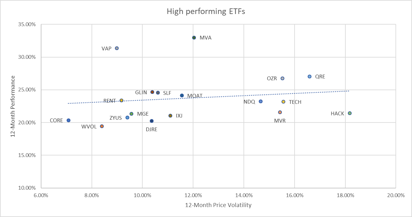 With the explosive growth of exchange traded funds or ETFs over the past few years, plenty of investors are wondering which ETFs to pick for their portfolios. In today’s article, we look at some of the best performing ASX-listed ETFs over the past 12-months, as well as the volatility of their price movements.