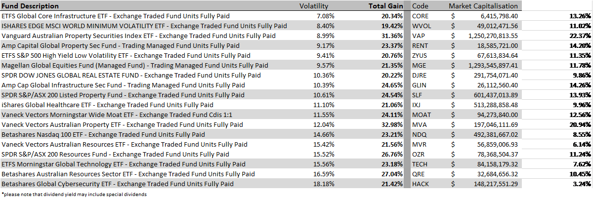 It is not uncommon to see some funds enjoy very strong performance followed by extremely weak performance, such is the nature of volatility, that is why we also look at the volatility of returns to try and determine if the levels of returns provided by a fund are worth the risk. Below are those same ETFs, sorted by lowest 12-month price volatility to the highest.